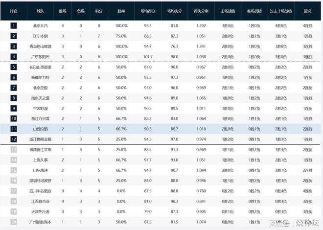 北京时间12月20日晚,2025/26赛季CBA常规赛第四轮6场比赛开始。本轮吉林、辽宁、山东、北京、浙江主场获胜。只有四川队主场输球,而南京队则在客场大胜。 CBA积分榜 长白山恩都力 92-86 新疆伊力特 上半场双方的争夺非常激烈,比分形势十分胶着。首节两队打成24平。第二季度,差距依然没有拉大。吉林队取得领先,以2分的领先优势结束半场。此后,吉林队在第三节也取得了微弱优势,领先对手5分打响最后一场比赛。不过,最后一节,新疆队的进攻始终受到限制。至此,吉林队已经连续2场获胜,总成绩提升至2胜2负,排名也升至第五位。新疆队苏遭遇本赛季第二场失利,目前战绩为2胜2负,排名跌至第六位。辽宁本钢90-88宁波鼎沃 辽宁队首节奋力冲刺,取得上风确立8分领先优势。第二节宁波队全力反击,很快将比分追成29平,而辽宁队及时得分以5分领先结束半场。此后,辽宁队在第三节打停对手,将领先优势扩大到12分。不过,宁波队末节全力反击,但还是差了一步。至此,辽宁队拒绝连败,纳纳洛取得新赛季第三场胜利,以3胜1负的总成绩领先。宁波队打得正劲,可惜输球,无缘连胜。目前2胜2负的战绩还不错。山东高速98-88比较北控与北控的这场战斗,双方的争斗十分激烈。首节双方势均力敌,最终北控领先3分。第二节,主场作战的山东队加大攻势反击对手,半场领先对手5分。此后,山东男篮在下半场始终占据着微弱的优势。北控男篮无论怎么打都被对手拦住了。山东队最终战胜了对手。到目前为止,山东男篮取得了2连胜,目前比其他球队少打了1场比赛,导致排名相对靠后。北控队遭遇2连败。好在前2轮连胜奠定了一些基础,目前第七名的排名还不错。北京北汽 104-88 深圳马可P深圳队首节打得非常出色,但进入第二节时已经领先10分,半场落后15分。深圳队的起伏很大。第二节进攻完全受到限制,只得到8分。此后第三节双方打得胶着,北京队依然将领先优势扩大到17分,并在节末成功拿下比赛。至此,北京男篮表现强劲,豪取4连胜,继续领跑CBA积分榜,并在本赛季再次冲击总冠军。深圳队开局阶段整体战绩平平。此役失利后,他们遭遇2连败。目前战绩为1胜3负。四川丰谷酒业53-84南京天之蓝 南京队本场比赛开局就背离客队,一直压制住对手。他上半场。首节他们爆发28-11建立起17分的领先优势,半场结束时领先优势达到22分。此后,四川男篮下半场依然处于被动局面,而且比分差距本身就相当大,导致比赛早早失去了悬念。南麂队客场成功拿下2分。至此,南京队取得了本赛季的第二场胜利,目前2胜2负的战绩还可以。四川男篮遭遇4连败,近年来整体战绩较为低迷。然而,升降级规则尚未实施,情况可能会继续恶化。浙江稠州金租88-79福建晋江文旅 浙江队正在力争赛季首胜。开局进攻效果不错,占据上风,建立7分领先优势第一季度d。不过第二节,福建队逆转扳回比分,半场双方打成44平。第三节,福建队稍稍占据优势,节末一度取得3分领先,但很快就被浙江队阻止,浙江队也将领先优势保持到终场。至此,浙江队终于拿下赛季首胜,摆脱垫底排名,球队整体形势有所好转。福建队遭遇两连败,本赛季顽强的实力几乎毫无意义。目前战绩为1胜3负,排名相当靠后。